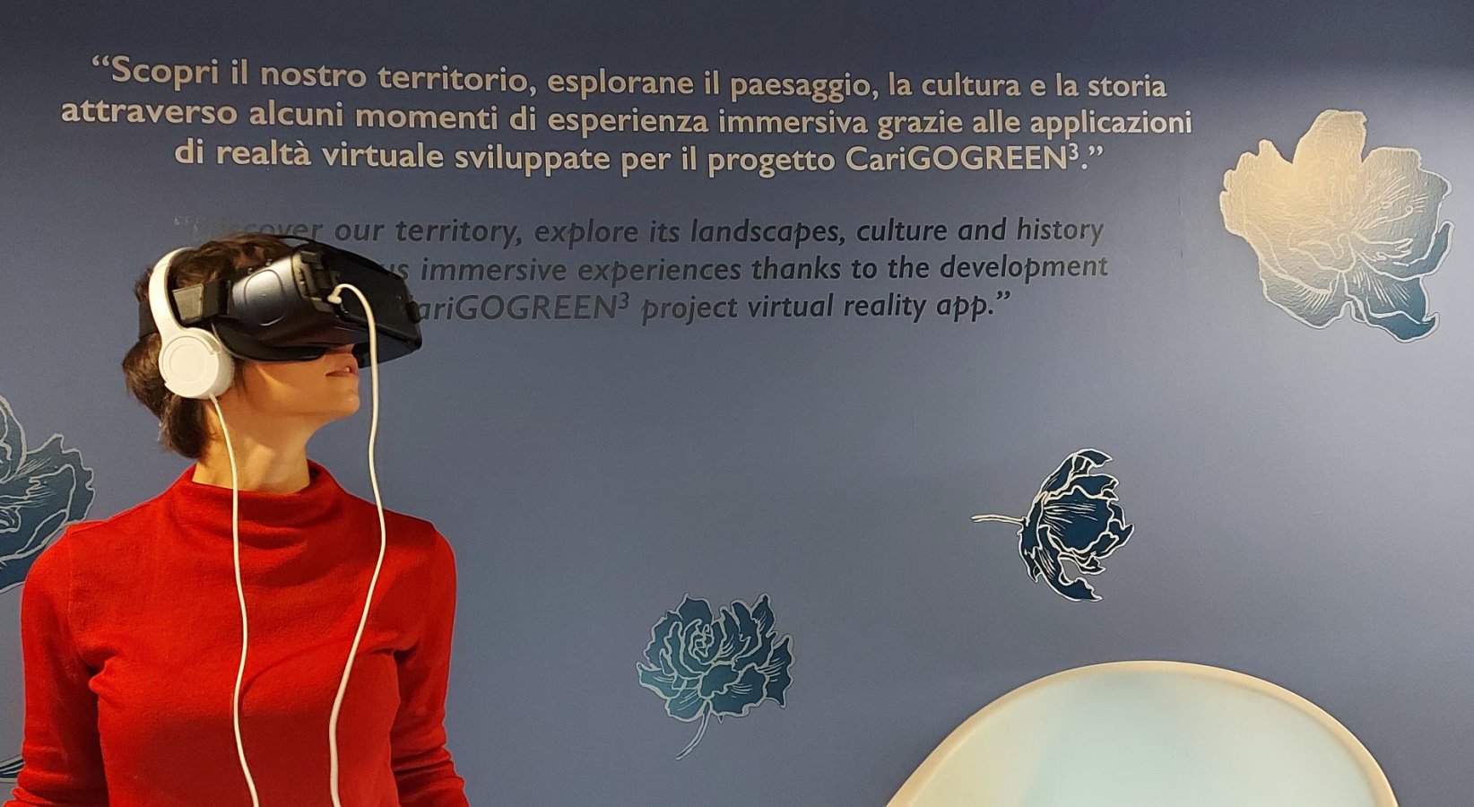L’esperienza digitale si articola in diverse postazioni, che comprendono touch point interattivi, postazioni AR+ e video, e un VR corner dove è possibile vivere esperienze immersive legate all’intero progetto CariGO GREEN.